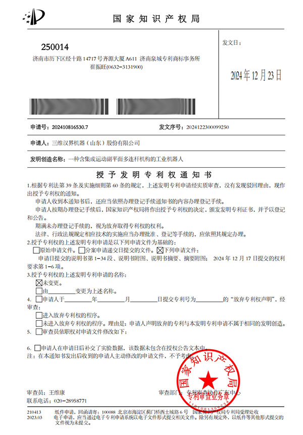 熱烈祝賀三維漢界機(jī)器(山東)股份有限公司首席科學(xué)家山顯雷教授親自主導(dǎo)研發(fā)的 “一種含集成運(yùn)動(dòng)副平面多連桿機(jī)構(gòu)的工業(yè)機(jī)器人” 成功獲得中國(guó)發(fā)明專利授權(quán)!